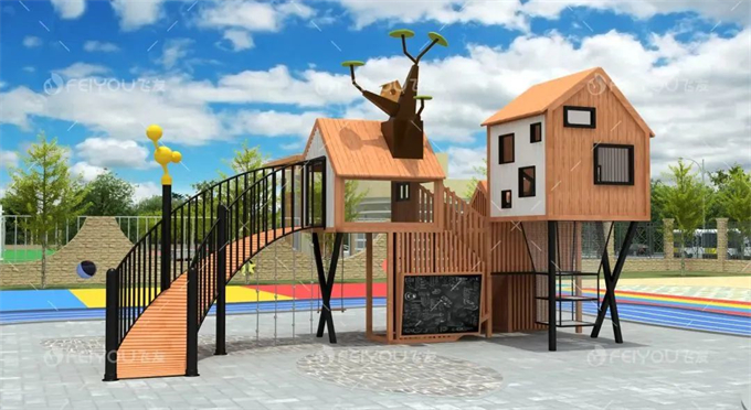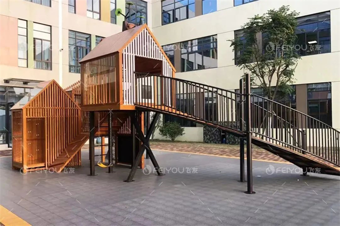 飞友以幼儿视角去观察孩子眼中的世界,在设计上,我们的户外游乐产品与园区建筑外立面上的原木栅栏和三角式的屋顶结构巧妙融合。以“魔法树屋”为主题,将斜桥中心幼儿园“心的教育·爱的成长”的办学思想融入到设计之中。
