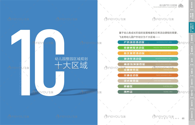 户外目录,我们将内容梳理为:幼儿园整园设计、户外十大区域规划、组合滑梯产品、体能训练产品、网绳攀爬产品、PE板材产品、户外木质产品、户外教室产品、户外玩具产品、户外运动包产品。