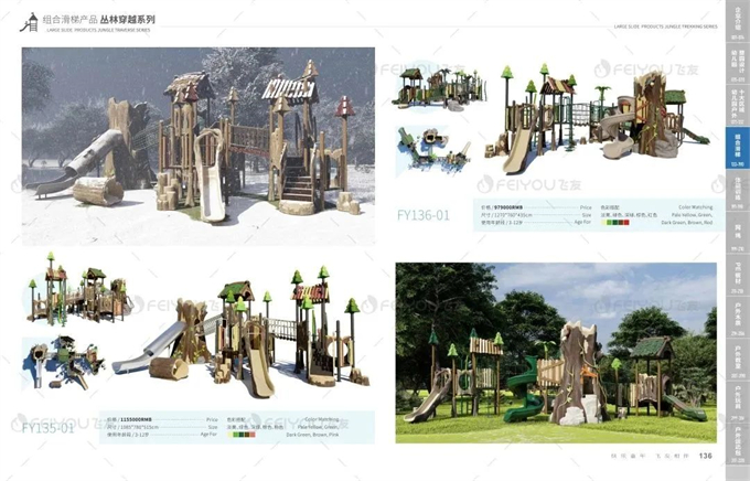 飞友2023全新组合滑梯产品——丛林穿越系列,模拟丛林生态,将滑梯设备与幼儿园自然环境巧妙融合,注重创造性艺术场景的打造,为幼儿感受与欣赏、表现与创造美提供了条件。