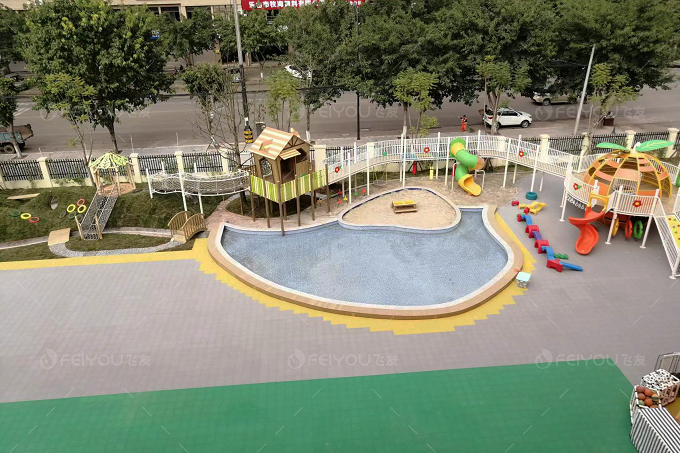 将露天室外内庭园搭建天棚,地上铺置软胶垫,以便雨天孩子活动防滑。将活动室全部铺置复合地板,方便孩子活动。将所有带棱角的地方做防护,以免孩子碰伤。将摆放大型玩具的地方种植草坪或铺置塑胶垫。
