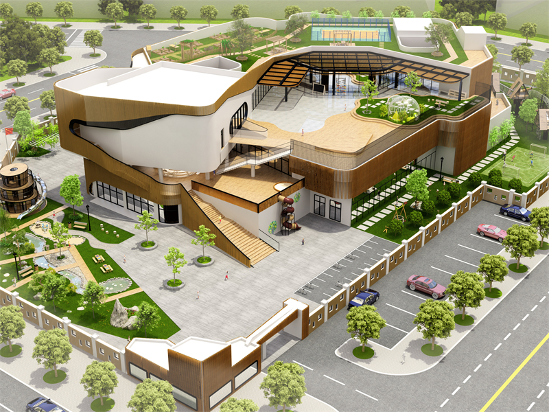 幼儿园室外设计也注重与大自然的连接。它的设计融入了自然元素,如绿色植物、花草和小溪。孩子们可以在花草丛中奔跑嬉戏,感受自然的美妙和生命的力量。设计中的小溪和人工湖泊也给孩子们提供了与水的互动机会,他们可以在水中玩耍,观察水的流动和声音,获得对水的认识和尊重。这样的设计不仅让孩子们与自然和谐相处,还培养了他们对环境保护的意识。