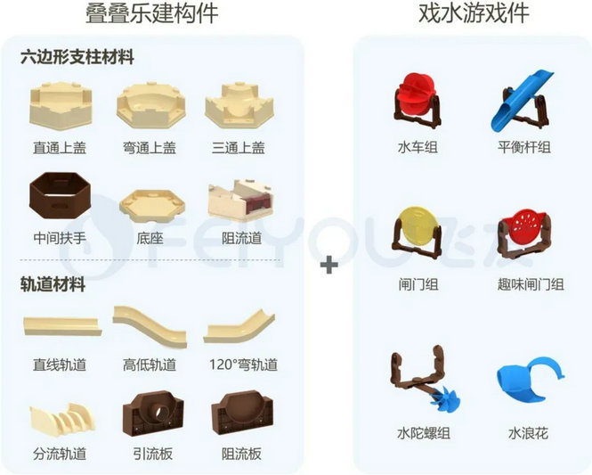 沙水王国之戏水叠叠乐主要由两部分组成——叠叠乐建构部件与戏水游戏部件。