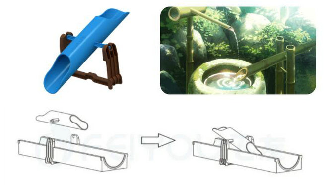 游戏建议:利用通用卡扣装搭在直线轨道上,摆放在水源下方,当水流满杆后,平衡被打破。筒杆就会反转把流入的水倒出。游戏效果模拟日本“添水”。