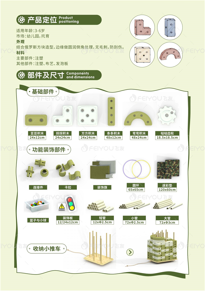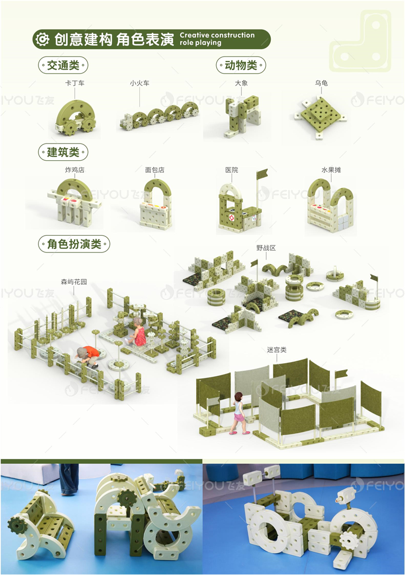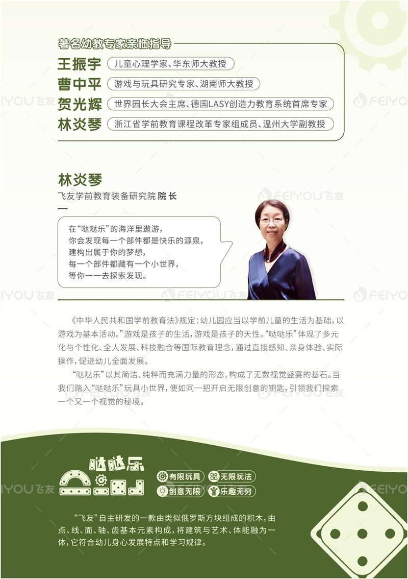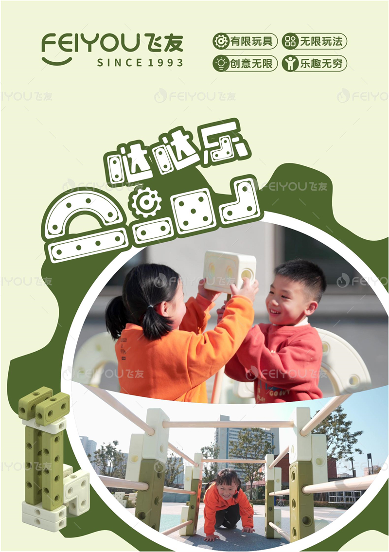 “飞友”自主研发的一款由类似俄罗斯方块组成的积木,由点、线、面、轴、齿基本元素构成,将建筑与艺术、体能融为一体,它符合幼儿身心发展特点和学习规律。